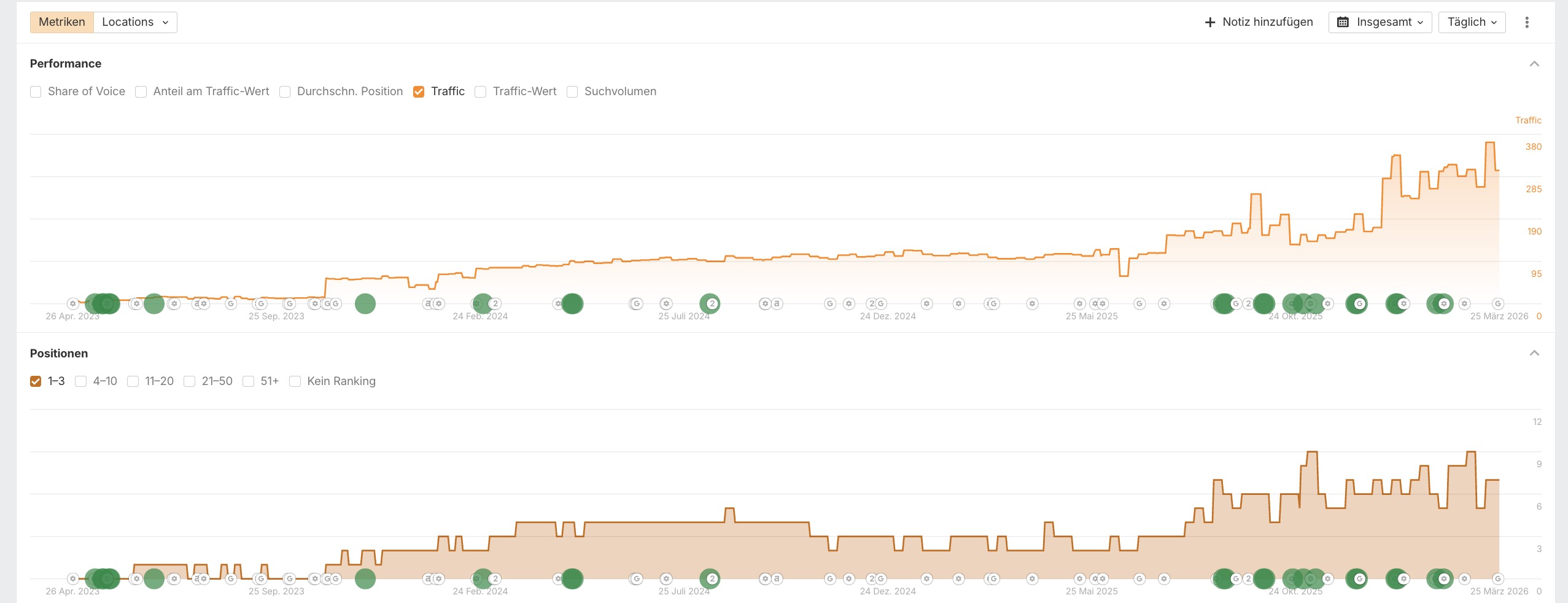 | Organischer Traffic | Von ca. 95 auf Spitzenwerte von über 380 | +300% Wachstum |